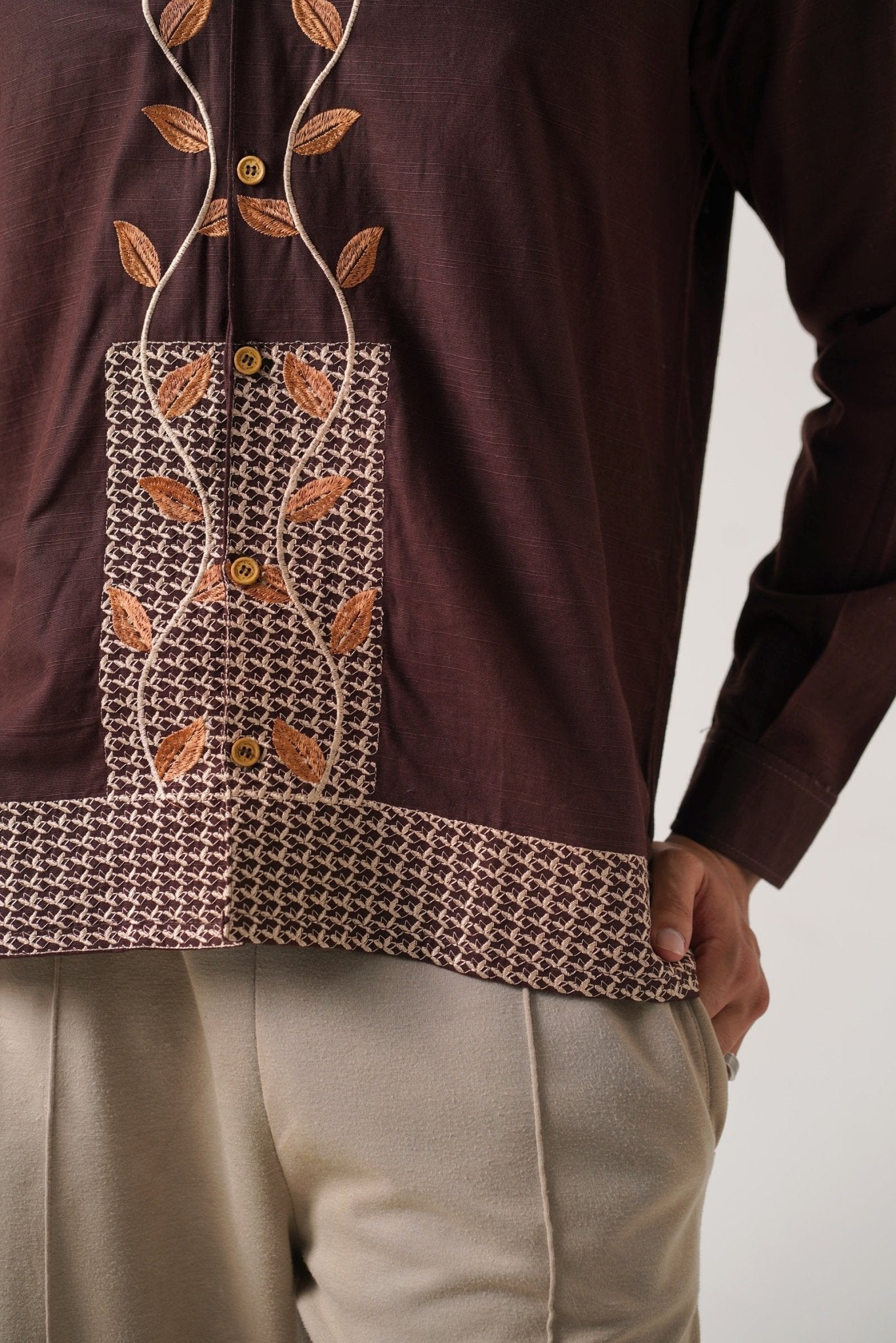 Embroidered Brown Full Sleeves Unisex Shirt...